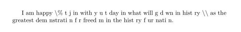 소문자 'o' (십진수로 111)에 catcode 10을, \\과 \%에 catcode 11을 부여하고, 나머지는 이미 정해진 대로 한다. 그래서 'today'가 't day'로 바뀌었다.