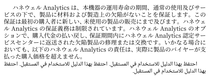 ハネウェルAnalyticsの保証義務は制限されています。ハネウェルAnalyticsのオプションで、購入代金の払い戻し、 保証期間内にハネウェルAnalytics認定サービスセンターに返送された欠陥製品の修理または交換です。